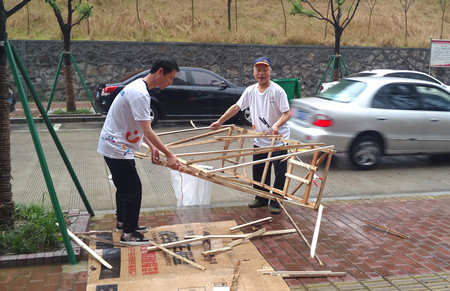 圖為志愿者在街邊清理廢棄用品