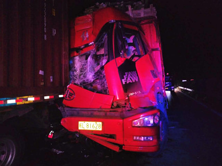 圖為被撞壞的ETC設備 當晚事故接連不斷。晚上22點40分,臺州收費所ETC進口處,一輛大客車行李車門撞歪顯示屏,同時也撞壞了一只抓拍攝像頭,造成了較大的路產損失,但是當班員工都正在路面上施救,施救中心領導統籌部署,通知兩位在所非當班人員赴崗上班,緊急出動,發揮連續作戰精神,進行及時處理。 當以上事故處理完畢,施救人員正準備往回趕的時候,當晚23點10分左右,四輛大貨車在寧向1667K+300M處連環追尾,其中一輛紅色大貨車車頭嚴重變形并且不斷向外漏油。現場極不安全,情況危急,施救中心員工馬不停蹄,又一次拉響了救援車的警報,為了爭取時間,甚至通知了另外地點待崗的人員火速趕來,以便能及早處理。此時,施救中心當班人員已經全體出動,全部戰斗在路上。 王凱