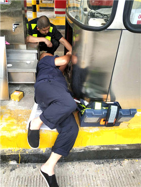 面對新的挑戰,中心隊員毫不畏懼,憑著嫻熟的技能,做網線、接電源、找插板、聯系授權......忙得連喝水時間都沒有,他們或彎腰或半蹲,甚至整個人趴到了地面上就是為了找一根相應的數據線和配置端口。經過共同努力,新架設的收費電腦一次性通過了過車測試,出口車道瞬間增加一個,三車道成了四車道。 這是維養中心首次啟動“一崗雙職”收費新模式,通過外接和配置相關設備,實現一個崗亭同時承擔發卡和收費雙職能,大大減少了車輛等待時間。